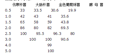(三)紫外線滅菌法:波長200~300nm,易穿透潔凈的水和空氣,用于空氣和物體表面滅菌。紫外線燈有效使用期一般為3000小時。 紫外線照射時間對微生物殺滅率見表: 照射時間(小時) 殺 滅 率 (%)